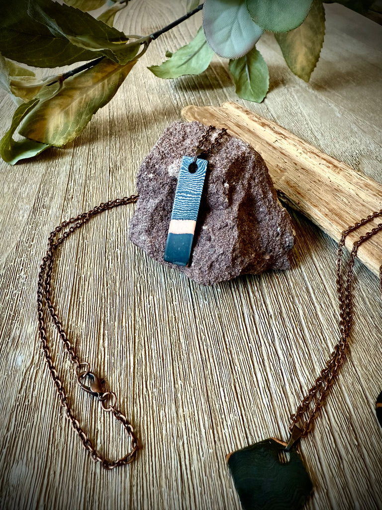 Hand-forged necklaces. From the fires of the forge to elegant and artistic pendants, no two pieces are the same. Made from 80crv2, 15n20, 1084, and copper. Chain is copper alloy to match the copper strewn throughout the pendant.